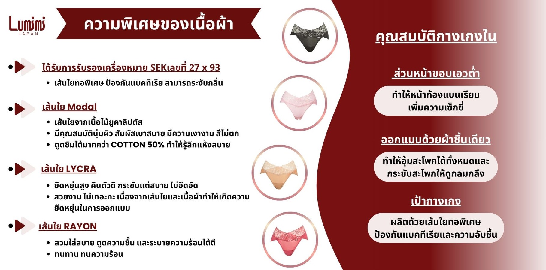 Properties include a soft feel against the skin, light and comfortable touch, a glossy appearance, and colorfastness (colors do not run).
